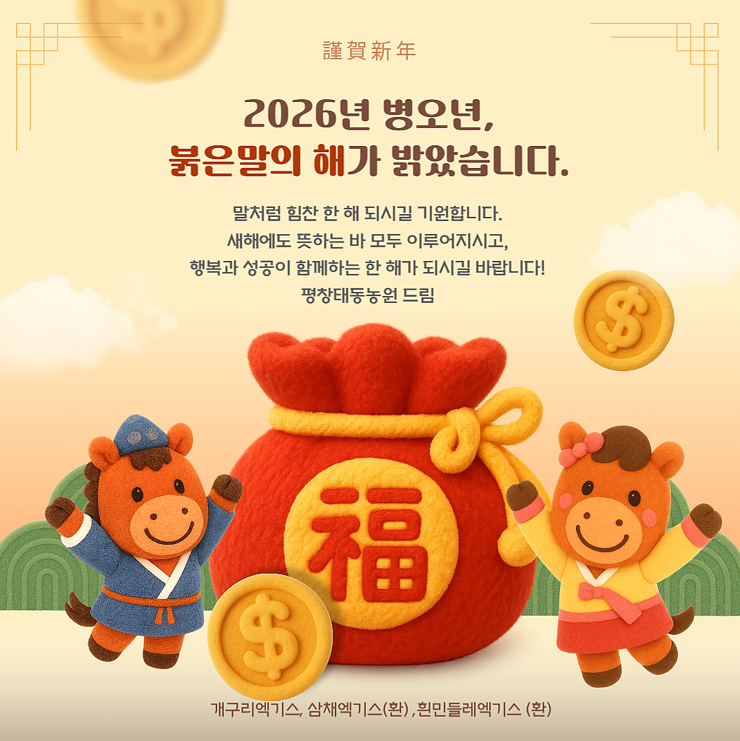 2026년 병오년, 붉은말의 해가 밝았습니다말처럼 힘찬 한 해 되시길 기원합니다.새해에도 뜻하는 바 모두 이루어지시고, 행복과 성공이 함께하는 한 해가 되실길 바랍니다!-평창태동농원 드림- 문의사항은 010-6691-8767010-8600-3575<<부재시 문자 남겨주세요>>